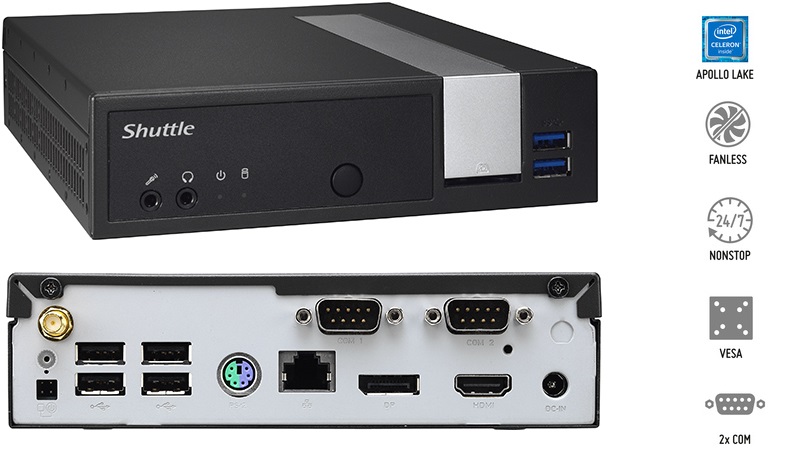 El Shuttle XPC slim Barebone DX30 es el sucesor de la serie XS35/XS36 de Shuttle. Este slim PC Barebone sin ventilador y con su ahorrativo procesador Intel Celeron J3355 «Apollo Lake» es apropiado tanto para la la construcción de nettops especialmente finos con sus unidades de disco y sistema operativo, como también para aplicaciones de uso en red en entornos cliente/servidor. Los gráficos integrados se apoyan en el potente sistema Intel HD Graphics 500 (gen. 9) con aceleración por hardware para codificación y decodificación de vídeo de 4K con H.265 y VP9. Junto con la memoria SSD, el sistema sin ventilador no emite prácticamente ruido alguno y es también apto para un funcionamiento continuo.